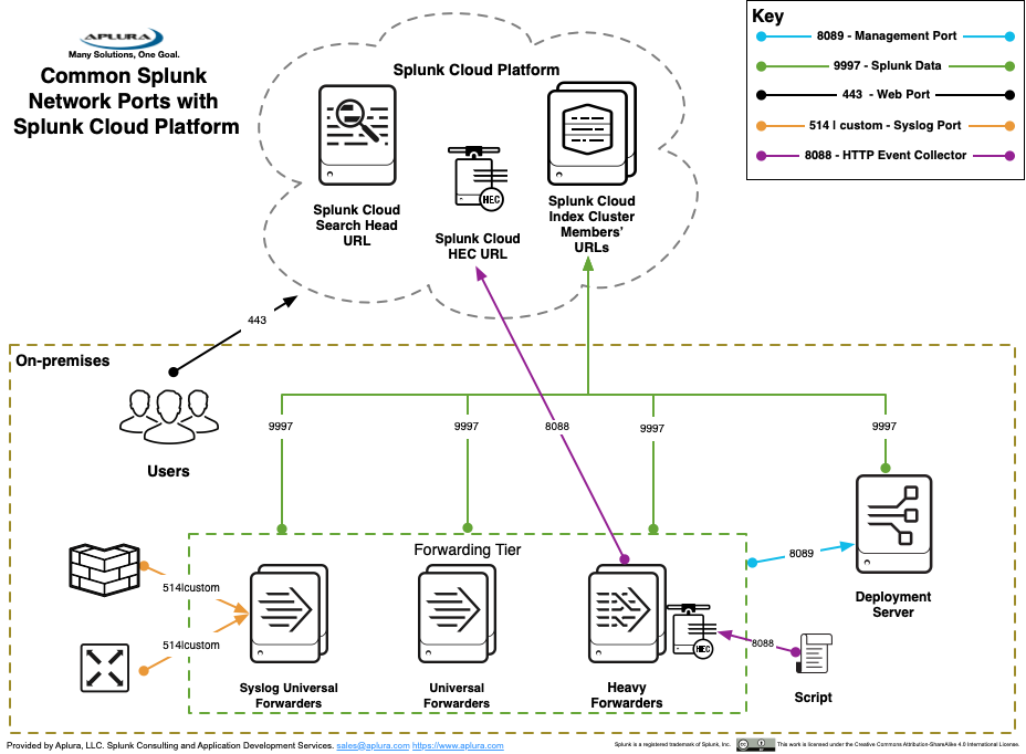 Common network ports and URLs for Splunk Cloud deployments for firewall and proxy rules. PDF PNG Previous Next